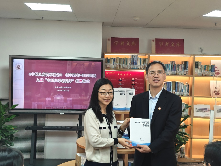 2026年1月12日下午,《中国人力资本报告》(2010—2025年)入藏“中财大学者文库”捐赠仪式在中央财经大学沙河校区图书馆举行。活动由图书馆馆长应展宇主持,创新发展学院人力资本与劳动经济研究中心、图书馆相关负责人及师生代表出席。