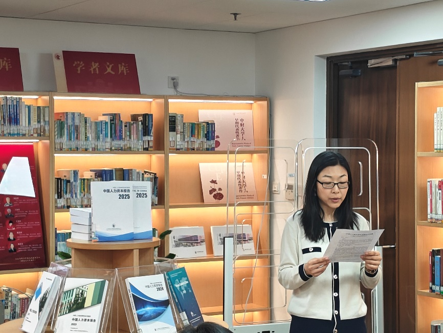 随后,图书馆副馆长张琼华介绍了“中财大学者文库”与“龙马文萃”平台建设情况。她表示,“学者文库”自2024年启动,旨在遴选最能代表学校学术水准与发展脉络的著作与报告,打造具有中财特色的高质量馆藏;“龙马文萃”则作为校内学术成果发布平台,通过新书发布、访谈与研讨等形式,持续扩大本校学术成果的传播力与影响力。《中国人力资本报告》系列入藏,将进一步丰富图书馆特色资源,为相关领域研究与教学提供重要文献支撑。